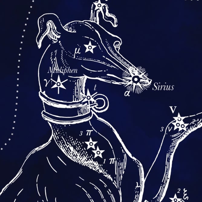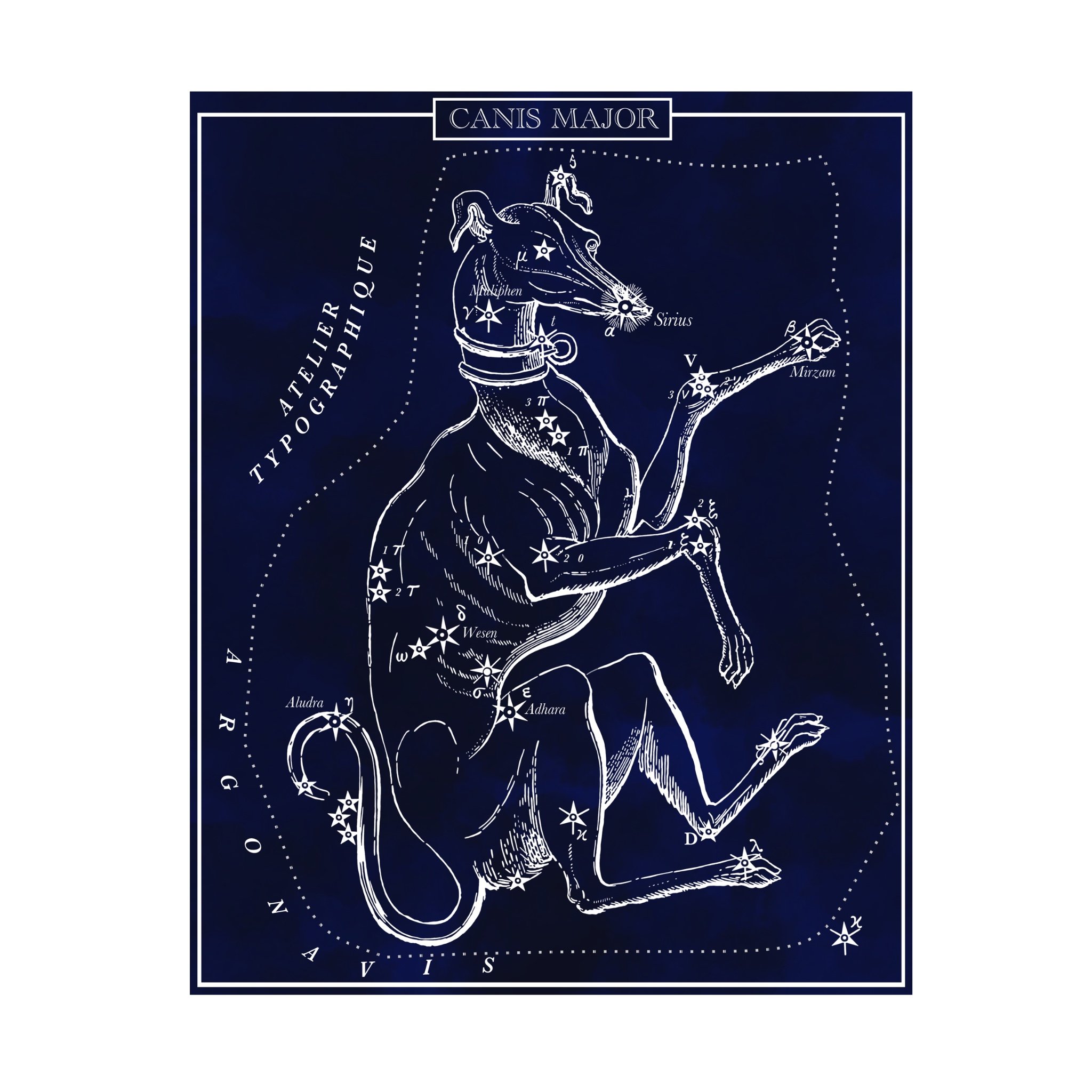 This print is perfect for any astronomy lover. Featured is the constellation, Canis Major (The Greater Dog). The constellation belongs to the Orion family of constellations along with Canis Minor, Lepus, Monoceros, and Orion.