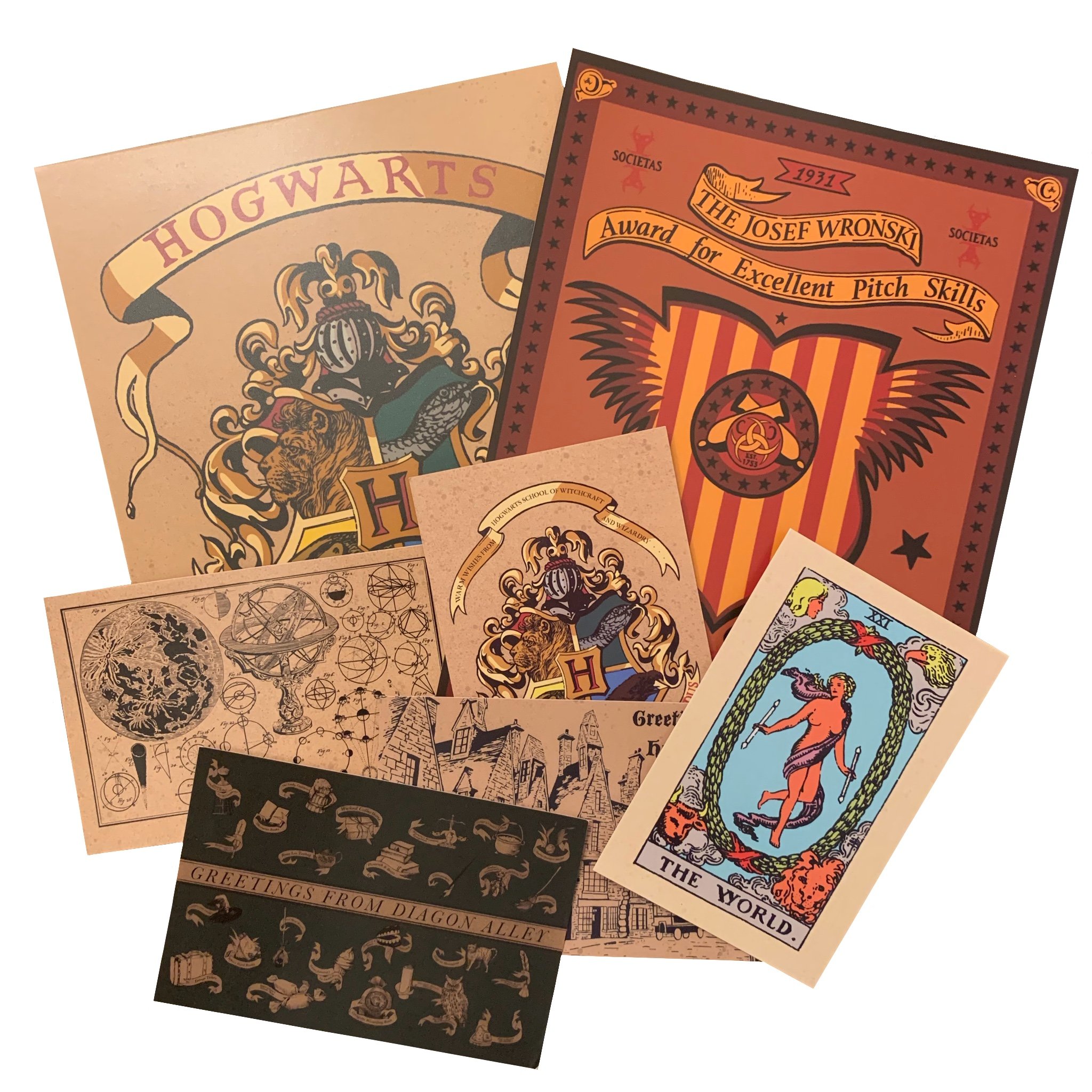 In addition to the 2 prints is a set of 5 magical postcards featuring designs for: Astronomy, Hogwarts School of Witchcraft & Wizardry, "The World" Tarot Card, Hogsmeade, and Diagon Alley.