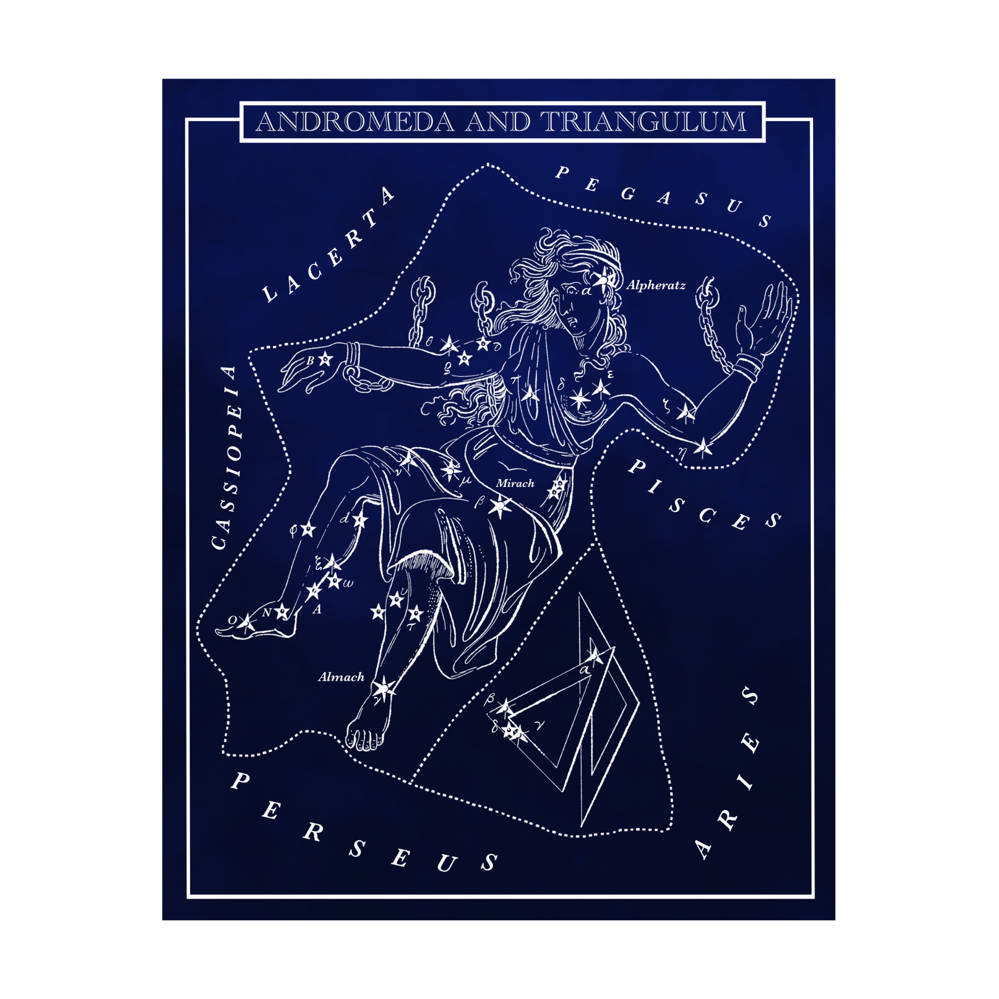 This print is perfect for any astronomy lover. Featured are the constellations, Andromeda (The Chained Maiden) and Triangulum (The Triangle). Both constellations belong to the Perseus family of constellations along with Auriga, Cassiopeia, Cepheus, Cetus, Lacerta, Pegasus, and Perseus.